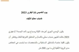 يوم الخميس 16 فيفري 2023 ضباب محليا كثيف، حيث يكون الوضع الجوي آخر هذه الليلة وصباح يوم الغد الجمعة 17 فيفري 2023 ملائما لظهور ضباب محلي بالشمال والمناطق الشرقية للبلاد.