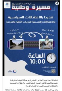 وبينت حركة النهضة، أن المسيرة ستنطلق يوم الأحد 05 مارس 2023 بداية من الساعة 10:00 صباحا انطلاقا من ساحة الباساج في اتجاه شارع الحبيب بورقيبة الى عبر شارع باريس.