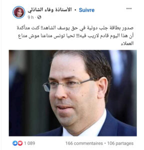 أفادت المحامية والناشطة السياسية وفاء الشاذلي في تدوينة نشرتها على صفحتها الرسمية بالفيسبوك اليوم انه تم اصدار بطاقة جلب دولية في حق رئيس الحكومة الأسبق يوسف الشاهد.