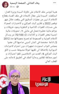 كتبت المحامية وفاء الشاذلي على صفحتها بالفايسبوك ما يلي :هنيئا لتونس ملف الاعلام على طاولة السبدة وزيرة العدل: استكملت السيدة ليلى جفال الابحاث في ملف الفساد بقطاع الاعلام اذ تبين من عمليات التدقيق التي وقعت خلال شهر نوفمبر 2022 و تقارير البنك المركزي و الاختبارات المجراة على حسابات القنوات الاذاعية و التلفزية وجود خروقات و جرائم مالية خطيرة تتمثل في مايلي