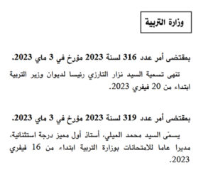 تضمن العدد الجديد من الرائد الرسمي للجمهورية التونسية الصادر بتاريخ يوم الجمعة 5 ماي 2023، أمرا يقضي بإنهاء مهام نزار التارزي رئيس ديوان وزير التربية