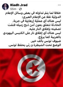 ليس هناك أي إطلاق نار على الكنيس اليهودي بالغريبة كما يروج. ضيوف تونس بألف خير. الوضع تحت السيطرة و ربي يحفظ تونس.