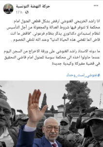 انا راشد الخريجي الغنوشي ارفض بشكل قطعي المثول امام محكمة لا تتوفر فيها شروط العدالة والمجعولة من أجل