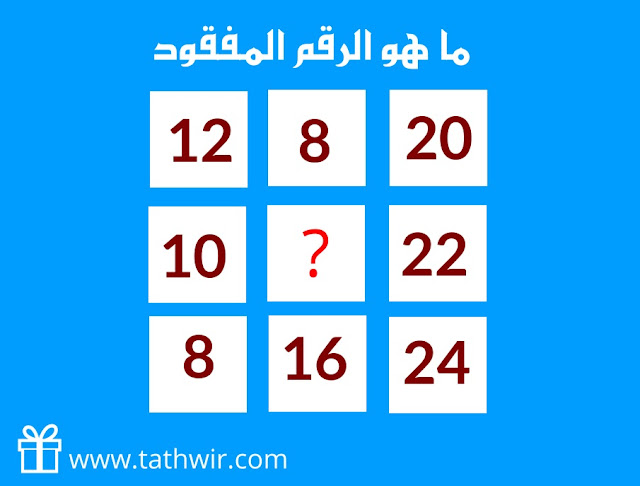 والمطلوب منك هو استنتاج الرقم المفقود في الخانة الفارغة في الوسط، وكذلك القاعدة الحسابية المطلوبة للوصول إليه.