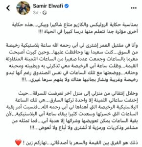 هكاكة شايخة على حكاية Gad ومناقلو و تعرضني ستاتو يحكي فيه الوافي على مناقلو الغالين الي تسرقو و فرحان كيفاش قعدتلو كان المنقالة الرخيصة الي هداهالو بوه الله يرحمو و قالك عمك الوافي هذاكة الفرق مابين القيمة و السعر..”.