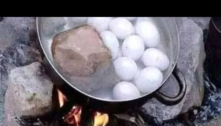 .3- الحجرفي الماء يمنع فوران الماء حتى لا تطفئ النار.4- الحجارة تحتفظ بالحرارة لفترة طويلة، وهنا تساعد على نضج البيض بسرعة، كما أنها تحافظ على درجة حرارة الماء لمدة أطول بعد إنزاله عن النار، بمعنى لو رجعت للبيض بعد ساعة ستجده ما زال ساخنا وليس بارد.