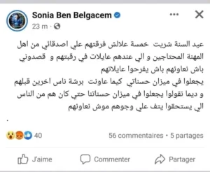 وجاء في تدوينتها :”عيد السنة شريت خمسة علالش فرقتهم علي اصدقائي من اهل المهنة المحتاجين و الي عندهم عايلات في رقبتهم و قصدوني باش نعاونهم باش يفرحوا عايلاتهم