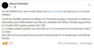 من جهتها، نشرت زوجته وصال تدوينة مؤثرة على حسابها الرسمي “فيسبوك”، أكدت فيها انه سيتم تشييع جثمان عزيز اليوم الاثنين 10 جويلية 2023،