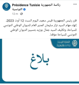 قرّر رئيس الجمهورية قيس سعيّد، اليوم السبت 12 أوت 2023، إنهاء مهام نزار سليمان المدير العام للديوان الوطني التونسي للسياحة، (شاهد : تحذير عاجل من اللجنة العلمية)