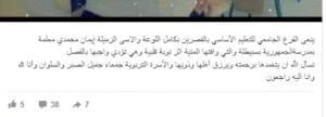 أكد المدير الجهوي للصحة بالقصرين عبد الغني الشعباني، لموزاييك، وفاة مربية داخل قسمها، بمدرسة الجمهورية بسبيطلة، أثناء آدائها لعملها، اليوم الجمعة 6 أكتوبر 2023.