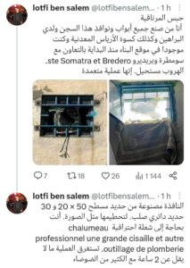 تداولت مواقع التواصل الاجتماعي الفيسبوك تدوينة للمقاول لطفي بن سالم نشرها على منصة “اكس” والذي قال فيها انه من قام ببناء شبابيك سجن المرناقية مؤكدا انها “عملية متعمدة”.