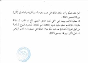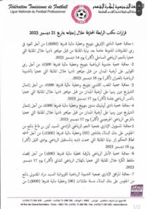 عقد مكتب الرابطة الوطنية لكرة القدم المحترفة اليوم الخميس 21 ديسمبر 2023 اجتماعه الدوري، وقرر في أعقابه تسليط غرامة قدرها 5000 دينار على النادي الافريقي بسبب رمي المقذوفات خلال مباراة النجم الساحلي الأخيرة، والايقاف لقائده وسام يحي لمدة ثلاث مباريات بسبب دفع وشتم الحكم زائد الغرامة بـ5150 دينار وفيما تفاصيل العقوبات.