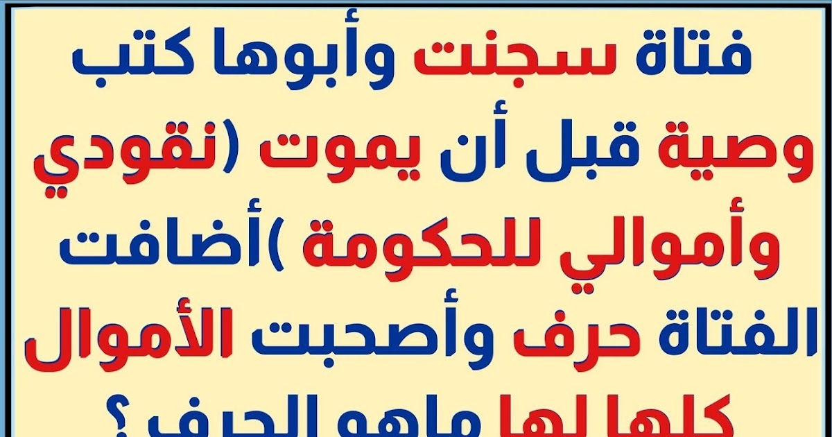 اللغز هو عبارة عن سؤال أو عبارة أو معادلة لا جواب مبهم يمكن أن يستنتج من خلال السؤال بطريقة سهلة أو صعبة لكنه يستدعي استحضار العقل والذهن والتفكير، ويعتمد على ذكاء الإنسان وتركيزه، ويتواجد بكثرة في الحفلات والمهرجانات. يسرنا ان نقدم لكم من خلال منصة موقع جـــيــ.ــل الغد حل الكثير من الأسئلة الدراسية وحل الألغاز الشعرية والشعبية والثقافية ونقدم إليكم حل اللغز : بنت سجنت وابوها كتب وصية قبل ان يموت كتب( نقودي واموالي للحكومة )البنت تصرفت بذكاء واضافت حرف واصبحت الاموال كلها لها ماهو الحرف