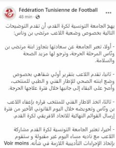 ⁠أخيرا، تعتبر الجامعة التونسية لكرة القدم مشاركة اللاعب مع ناديه مساء اليوم غير مقبولة و ستقوم بإتخاذ الإجراءات التأديبية اللازمة في شأنه.