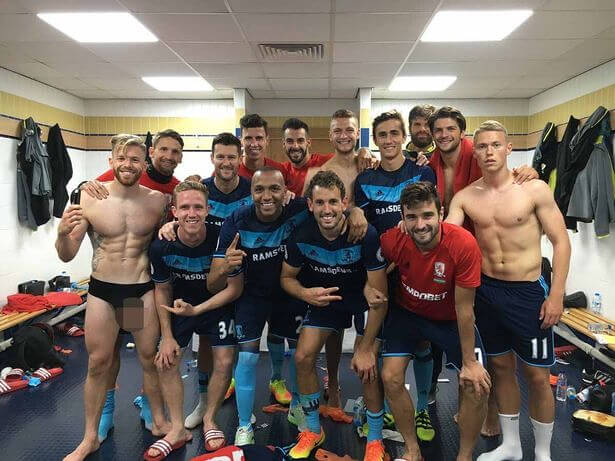 أقسى ما يمكن أن يحدث للاعب أن تضيع لذة انتصاره بعد اللعبة بسبب زلة سيئة، ولكن هذا بالضبط ما حدث بعد فوز ميدلسبره على سندرلاند في عام 2016. كان الشورط القصير للاعب خط الوسط، آدم كلايتون، قد انزلق قليلا قبل التقاط هذه الصورة مباشرة. وكان صديقه على يمينه مباشرة من أجل الإشارة إلى ما حدث خلال هذه اللحظة.