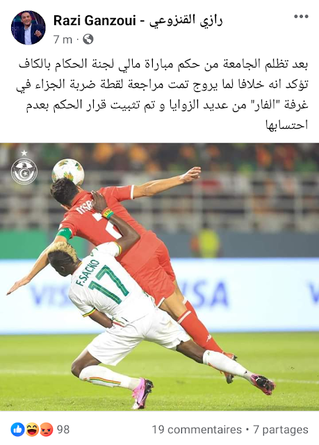 في تدوينة حديثة على فيسبوك، أكد مقدم برنامج الأحد الرياضي السابق “رازي القنزوعي” تظلم الجامعة من حكم مباراة مالي. تمت مراجعة لقطة ضربة الجزاء في غرفة “الفار” وتم تثبيت قرار الحكم بعدم احتسابها.