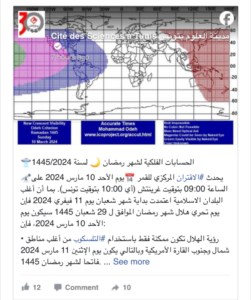 أفادت مدينة العلوم بتونس بخصوص الحسابات الفلكية لشهر رمضان، ان تونس ستتحرى الهلال يوم الأحد 10 مارس 2024 الموافق لـ 29 شعبان 1445 هـ، حيث تغرب الشمس على الساعة 18:23 ويغرب القمر على الساعة 18:41 أي 18 دقيقة بعد غروب الشمس،