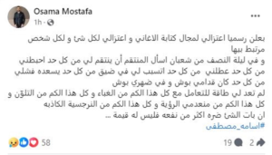وكتب أسامة مصطفى عبر حسابه بموقع Facebook: “بعلن رسميا اعتزالي لمجال كتابة الأغاني واعتزالي لكل شئ ولكل شخص مرتبط بيها، وفي ليلة النصف من شعبان اسأل المنتقم أن ينتقم لي من كل حد احبطني من كل حد عطلني من كل حد اتسبب لي في ضيق من كل حد يسعده فشلي من كل حد كان قدامي بوش و في ضهري بوش”.