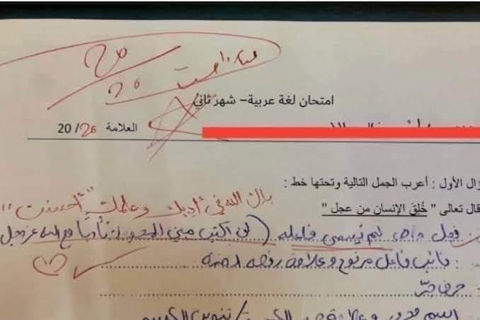 ولكن نجد أن الطالب قد قام بالاجابة على هذا السؤال بطريقة مختلفة تماما على غير المتوقع وليس بإتباع قواعد الإعراب والنحو المعروفة والتي قام بدراستها وهذا ما جعل المدرس القائم بالتصحيح يبكي من تلك الاجابة المذهلة والتي سوف نتعرف عليها في الفقره القادمه.