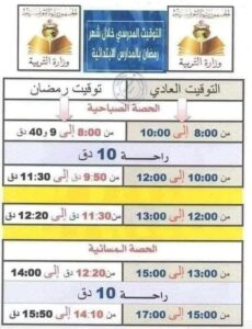 وأفادت وزارة التربية أنه تيسيرًا للعمل اليومي بمختلف المدارس الإعدادية والمعاهد العمومية والخاصة خلال شهر رمضان، تقرّر أن تكون أوقات الدروس كالآتي: