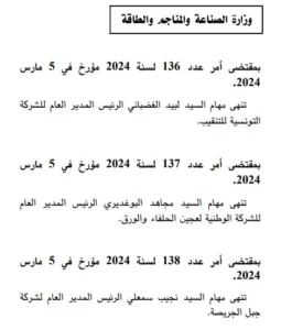 أعداد 136 و137 و138 لسنة 2024 مؤرخة يوم 5 مارس تنص على إنهاء مهام الرؤساء المديرين العامين لمؤسسات: