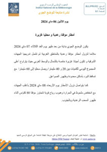 يكون الوضع الجوي، بداية من بعد ظهر غد الثلاثاء، ملائما لنزول أمطار مؤقتا رعدية بالمناطق الغربية تشمل تدريجيا المناطق الشرقية وتكون أحيانا غزيرة خاصة بالشمال والوسط الغربي.
