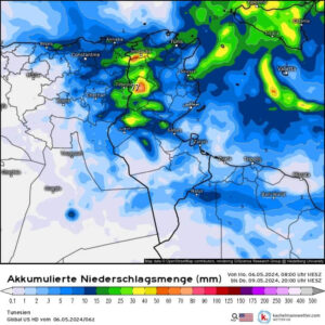 ورجح المعهد الوطني للرصد الجوي، في نشرة متابعة اصدرها اليوم الاثنين 06 ماي 2024 ، أن يتراوح أعلى المجموع اليومي لكميات الامطار بين 20 و40 مليمترا ويصل محليا الى 60 مليمترا مع تساقط البرد بأماكن محدودة علاوة على ظهور الصواعق