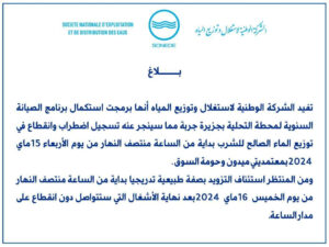 ومن المنتظر استئناف التزويد بصفة طبيعية تدريجيا بداية من الساعة منتصف النهار من يوم الخميس 16 ماي 2024 بعد نهاية الأشغال التي ستتواصل دون انقطاع على مدار الساعة.