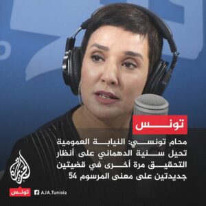 أعلنت هيئة الدفاع عن المحامية سنية الدهماني اليوم السبت 8 جوان 2024 أن النيابة العمومية بالمحكمة الابتدائية بتونس قررت احالة موكلتهم على التحقيق وذلك لاستنطاقها بخصوص قضيتين جديدتين تعلقتا بتصريحات سابقة كانت قد ادلت بها في منابر تلفزية وإذاعية..