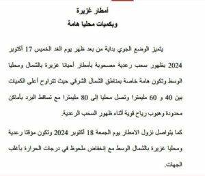ومن المنتظر أن تتراوح أعلى الكميات بين 40 و60 ملّيمترا، وتصل محليا إلى 80 ملّيمترا، مع تساقط البرد بأماكن محدودة، وهبوب رياح قوية أثناء ظهور السحب الرعدية.