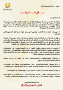 وجدد الحزب دعوته كل القوى الوطنية إلى التكاتف لمواجهة كل أشكال العنف والفوضى، والعمل المشترك من أجل بناء وطن يحمي كرامة مواطنيه ويسوده العدل والأمان”.