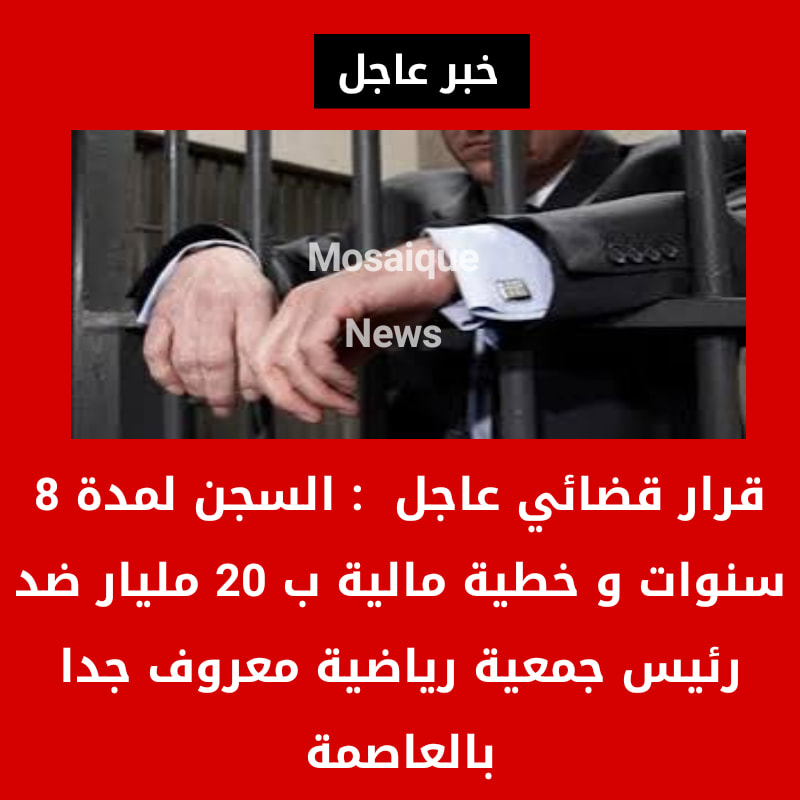 قرار قضائي عاجل : السجن لمدة 8 سنوات وخطية مالية ب 20 مليار ضد رئيس جمعية رياضية معروف جدا.