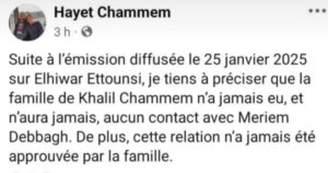 وفي ذات السياق نشرت والدة خليل شمام على صفحتها الرسمية بموقع التواصل الاجتماعي فايسبوك تدوينة كذبت فيها مريم الدباغ . وفيما يلي نص التدوينة